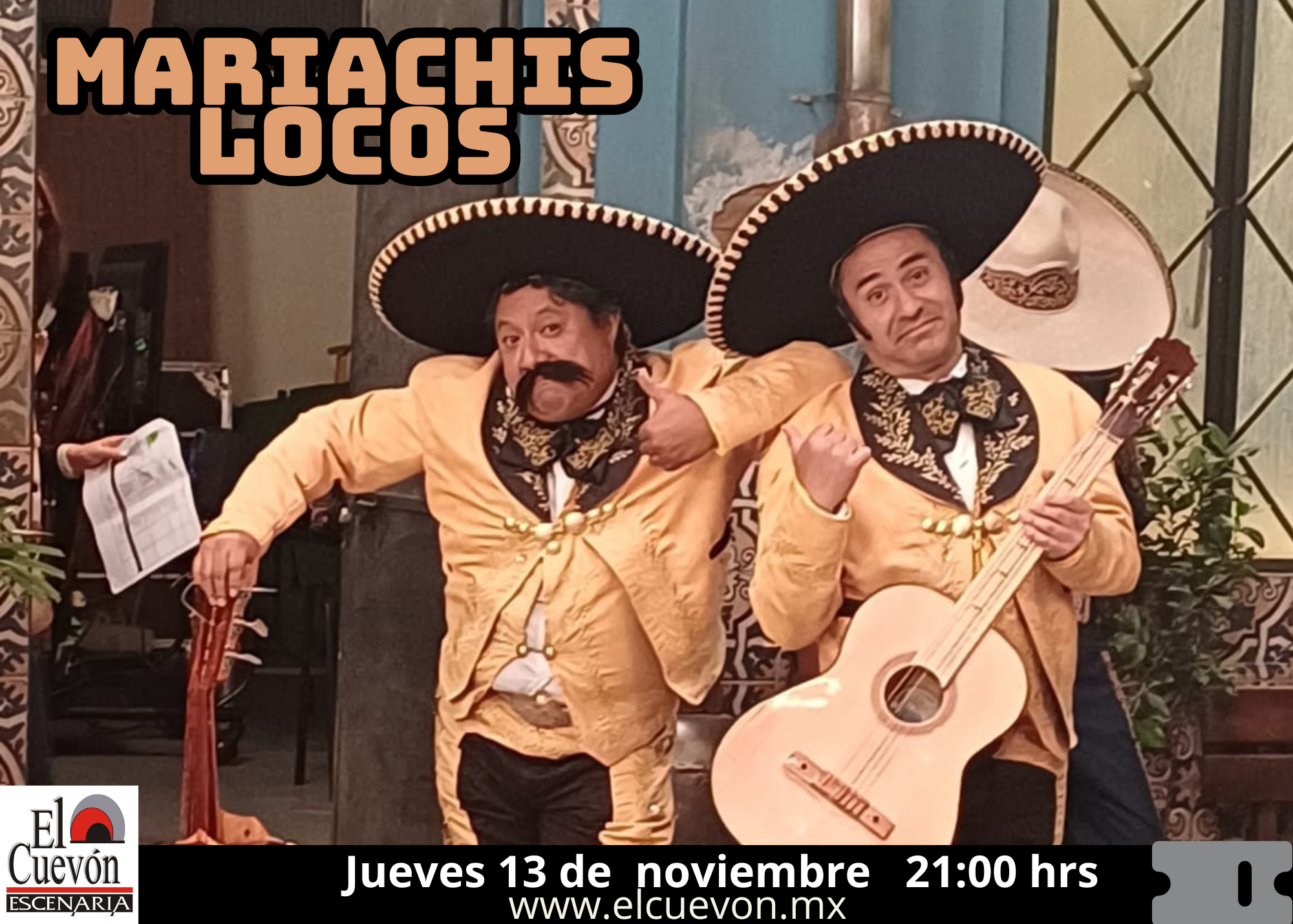 LOS MARIACHIS LOCOS JUEVES 13 DE NOVIEMBRE 21:00 HRS + Añadir Google Calendar + exportación iCal / Outlook El evento está terminado. Fecha Nov 13 2025 ¡Caducado! Hora 9:00 pm Coste MXN250.00 Localización El Cuevon Escenaria Compartir este evento