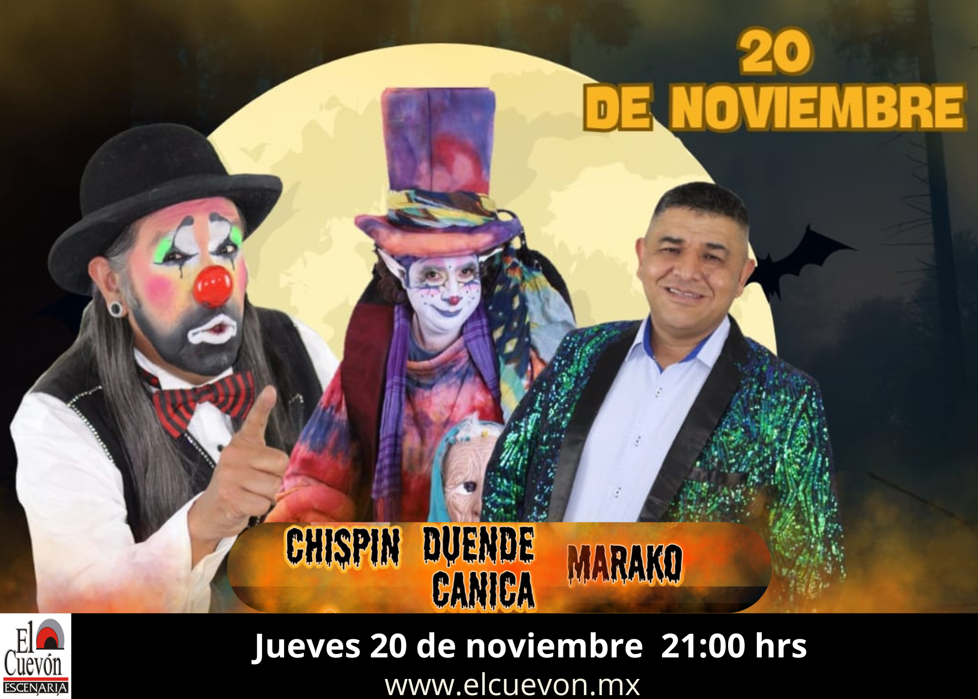 MARAKO, CHISPIN Y DUENDE CANICA JUEVES 20 DE NOVIEMBRE 21:00 HRS + Añadir Google Calendar + exportación iCal / Outlook El evento está terminado. Fecha Nov 20 2025 ¡Caducado! Hora 9:00 pm Coste MXN250.00 Más Información Leer más Localización El Cuevon Escenaria Organizador EL CUEVON Teléfono 5578853121 Leer más Compartir este evento