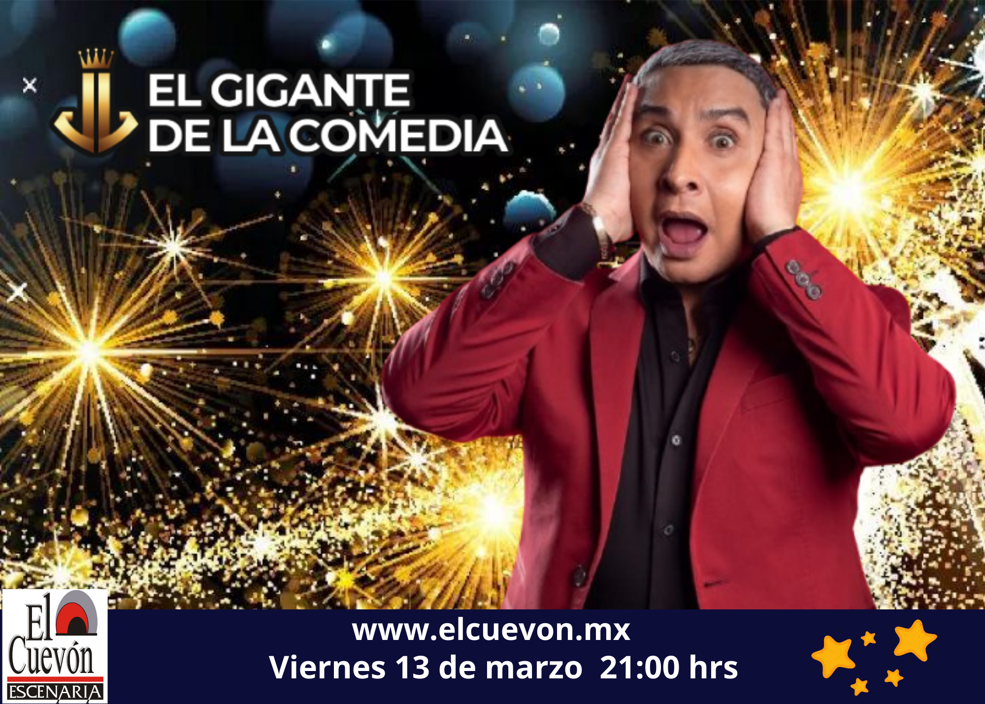 SHOW DE J.J. EL GIGANTE DE LA COMEDIA VIERNES 13 DE MARZO 21:00 HRS + Añadir Google Calendar + exportación iCal / Outlook 00 días 00 horas 00 minutos 00 segundos Fecha Mar 13 2026 Hora 8:00 pm Coste MXN800.00 Más Información Leer más Localización El Cuevon Escenaria Organizador EL CUEVON Teléfono 5578853121 Leer más Compartir este evento